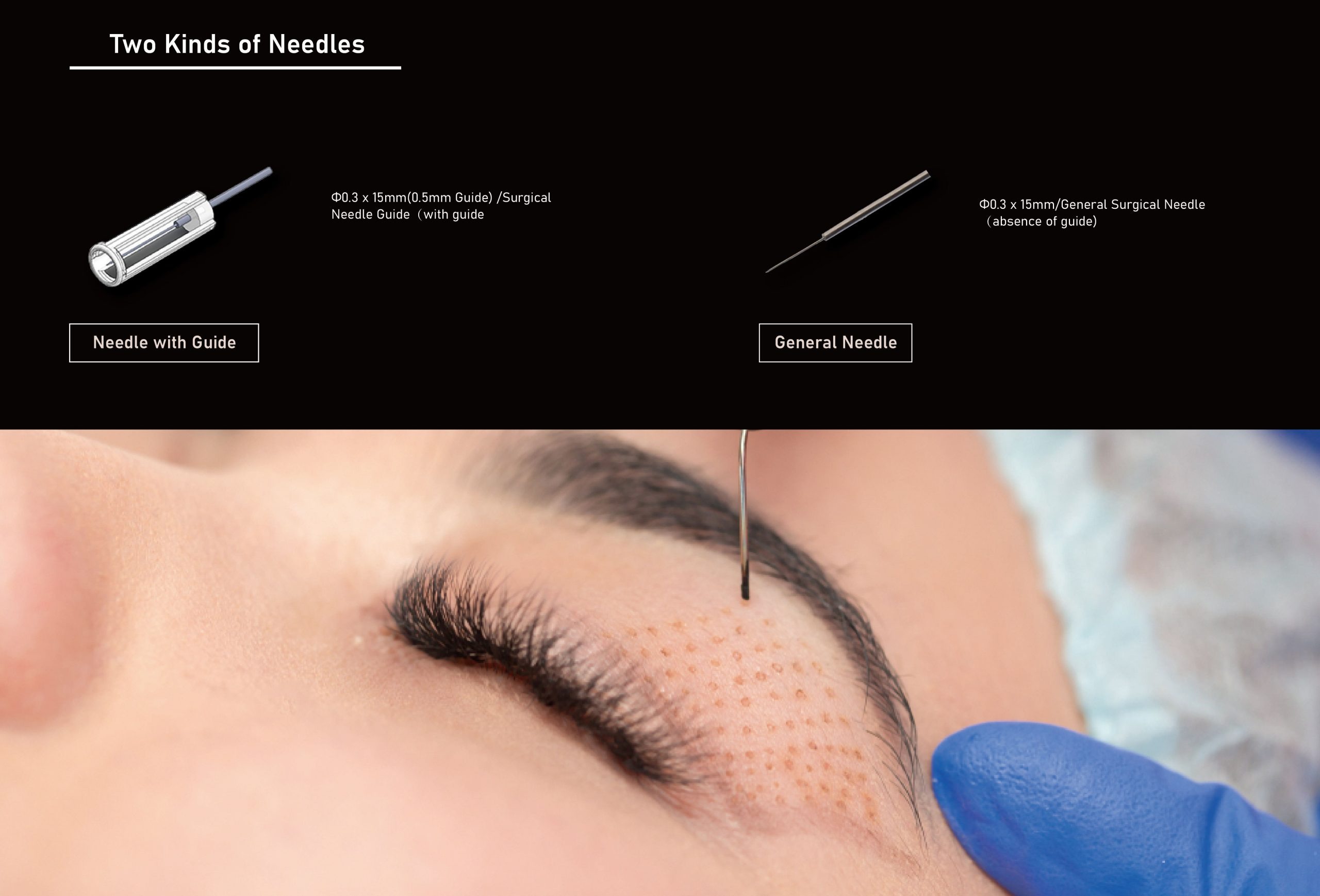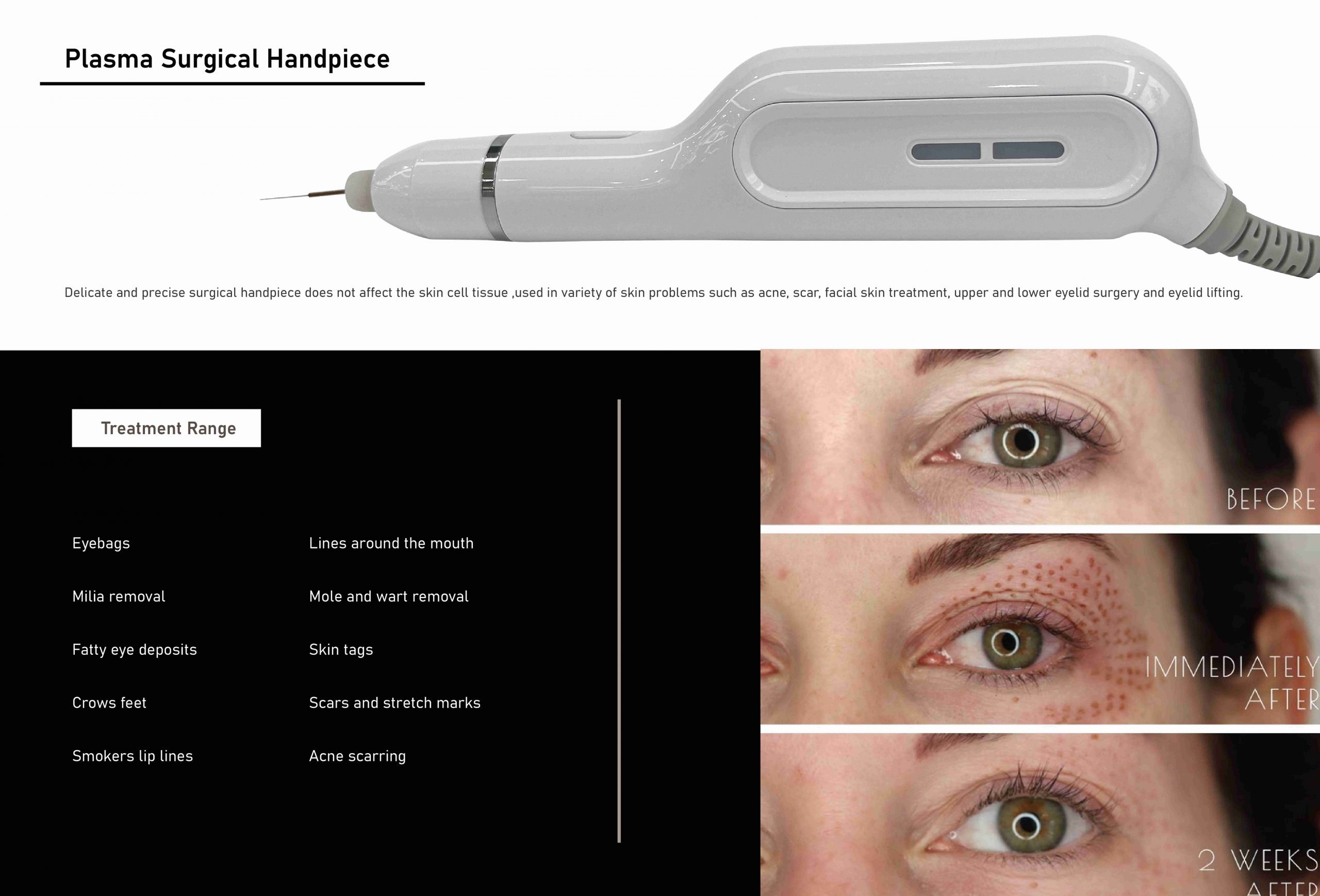 • ידית כירורגית לפלזמה – מגיעה עם 4 מחטים לטיפול כסטנדרט, קלות להרכבה ולהחלפה. המחטים עשויות כסף סטרלינג בעל מוליכות גבוהה במיוחד. טיפול באמצעות מחט דקה בקוטר 0.03 מ"מ נוח יותר, פחות כואב ופחות פולשני.