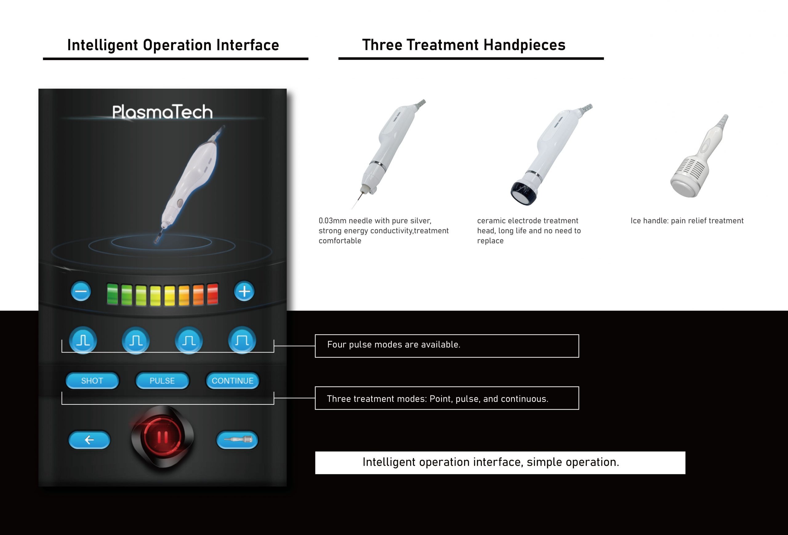 • ידית פלזמה – מצוידת בראש טיפול עם אלקטרודה קרמית חזקה ועמידה, המבטיחה בטיחות גבוהה במגע עם עור המטופל. הידית אינה כוללת חלקים מתכלים, וניתן לעשות בה שימוש חוזר לאחר חיטוי באלכוהול.