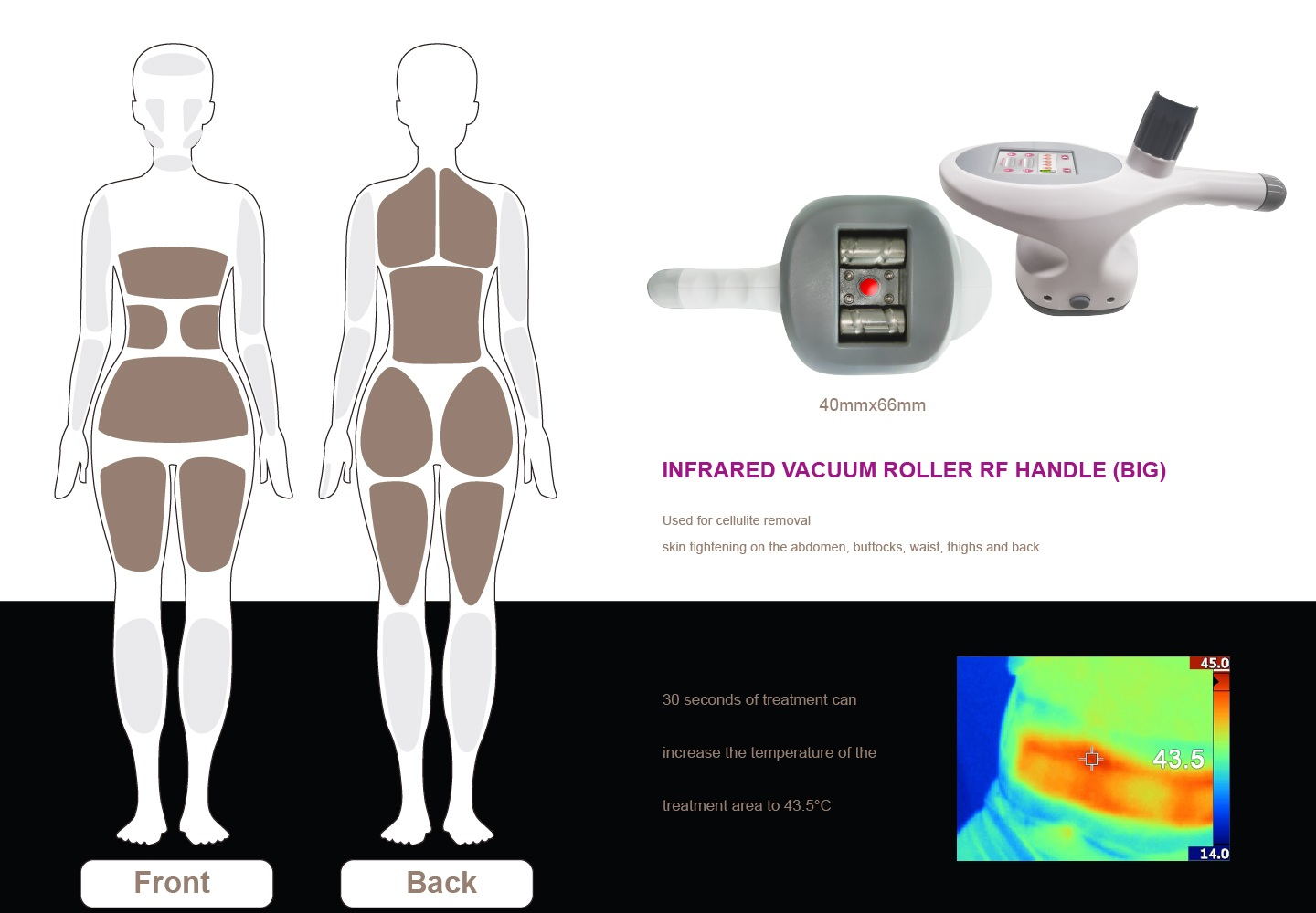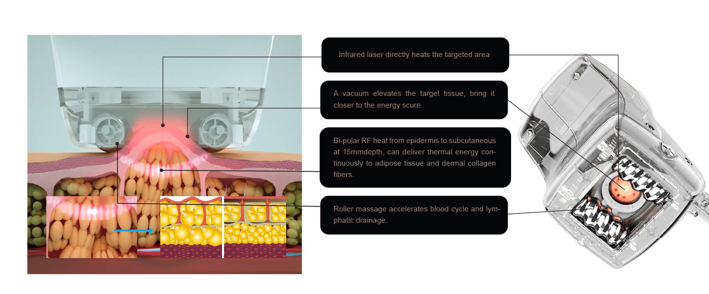 מכונת ואקום RF אינפרא־אדום עם רולר וקוויטציה משלבת חמש טכנולוגיות מתקדמות ופופולריות לעיצוב הגוף והרזיה: גלי רדיו (RF), ואקום בלחץ, לייזר אינפרא־אדום, גלילים מכניים וקוויטציה אולטרסונית. שילוב זה הופך אותה לפתרון רב־תכליתי לחיטוב, שיפור מרקם העור והפחתת היקפים.