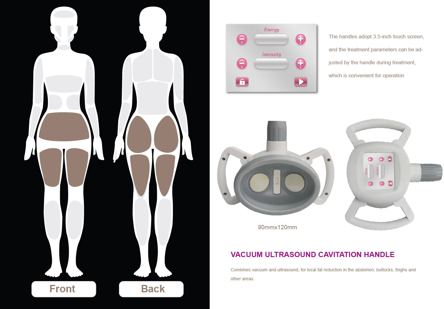 • 4 ידיות שונות – מאפשרות טיפול ב־6 אזורים שונים בגוף, להתאמה מלאה לכל מטופל.